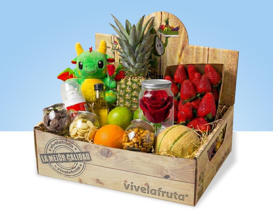 Su elemento más diferencial es el dragón de peluche 100% original, exclusivo de Vivelafruta y Frutas Antonio, que convierte esta cesta en una propuesta mucho más personal y difícil de encontrar. Además, incluye una cuidada combinación de productos con mucho color y presencia: fresas, piña, melón cantalupo, naranjas, limas, chocolate blanco, chocolate, frutos secos, aceite de oliva, nata en espray y una rosa presentada dentro de un bote.